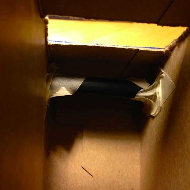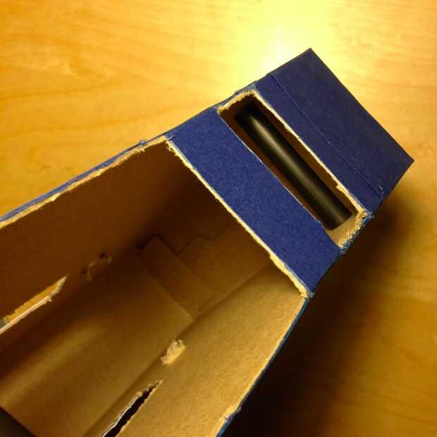 Una vez que sus pajas son lo suficientemente cortos para caber dentro de la caja, pero tiempo suficiente para estar estable, vamos a colocarlos. Queremos sostener la cinta hacia fuera más allá del 1" windows bordeando la ventana grande - puede eyeball la colocación dentro de la caja. Fijar en todos los lados con cinta de enmascarar, que se puede doblar alrededor de la paja circular más fácilmente que la cinta Scotch. Esto puede ser un poco complicado, ya que se trabaja en un espacio pequeño - sólo ser paciente y empezar de nuevo si es necesario.