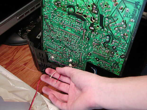 Verifique que su TV esté desenchufada. Aprendí la manera dura, no repetir mis errores simplón, a menos que tu en lo de descarga eléctrica. La mayoría de televisores tendrán un caso que se divide en dos secciones, una parte que rodea la parte frontal y otra parte que cubre la parte posterior. Para quitar el panel trasero, he en círculo las ubicaciones de tres tornillos en mi TV en rojo. Televisor probablemente será diferente. Ahora debería ver las tripas de su TV. No ser intimidados por el lío de cables y circuitos, eres solamente preocupación es localizar el altavoz dentro de la caja. Debe ser un cable rojo y blanco de la parte posterior del altavoz, deberás cortarlo y lo tira. Tenga cuidado de no cortar otros cables, como se puede ver en las fotos que fui una tijera poco feliz y terminó encima de matar al receptor de IR (los cables azul y blanco), representación del mando inútil. Ahora alimente el alambre que es cortado a través de un agujero en el caso. Mina tenía orificios en la parte inferior lo suficientemente amplia como para meter el cable a través de. Ahora conecte este cable al cable de la TV (rojo con rojo, blanco con blanco [o negra dependiendo de su cable]) y envuélvalo en cinta aislante para estar seguro. No quieres tener que volver sobre el caso porque el cable vino suelto. Buen trabajo, puntada ahora respaldo de su paciente. Coloque con cuidado la parte posterior del caso en la TV asegurándose que los orificios que toda Alinee correctamente.