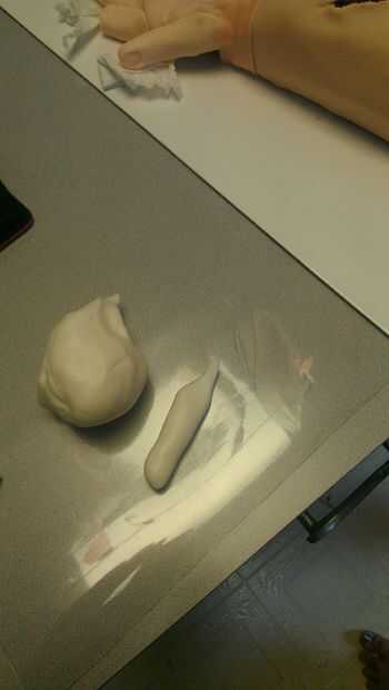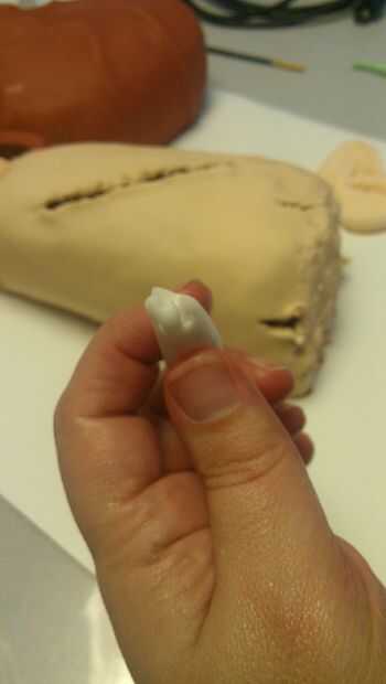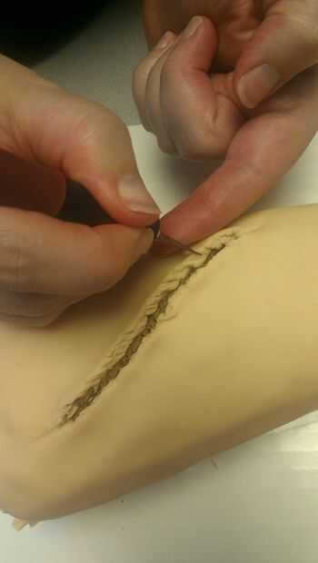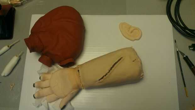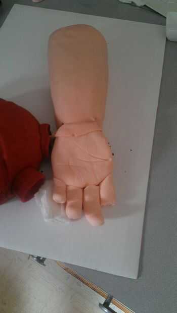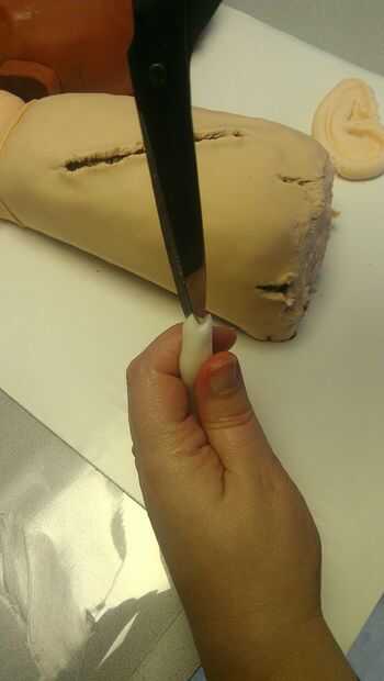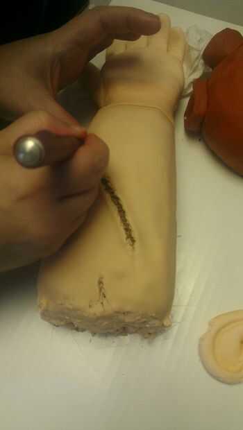 la sección cortada grande del antebrazo es un poco diferente... alrededor de la torta tratamos la piel del mismo modo que hicimos los cortes más pequeños. en el centro donde normalmente habría músculos y huesos que hicimos más cortes como si los músculos donde allí. No somos médicos... así que realmente no sabemos lo que debe parecerse pero hemos conjeturado.