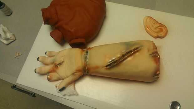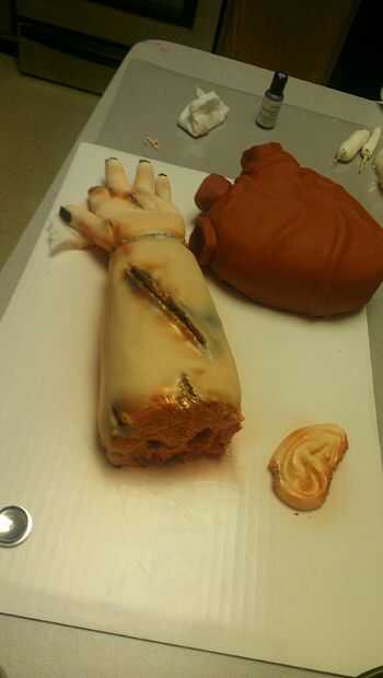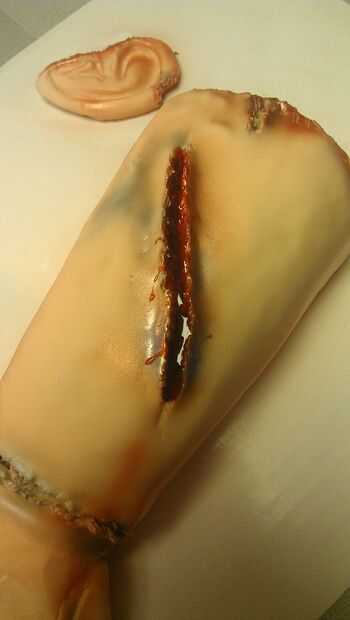 fuimos sólo los bordes de la mano y el oído con el colorante de alimento rojo brillo. añadido más estimado de los cortes y cuchilladas. También hemos añadido lavanda brillo alrededor de la piel de los cortes y cuchilladas... y en un par de puntos al azar para crear una apariencia de moretones.