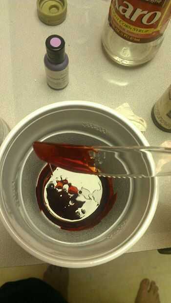 También necesitamos añadir el primer poco de sangre en las grietas. Esto se hace con colorante solo rojo y colorante brillo lavanda (la lavanda tiene un efecto de brillo a lo que la hace brillar) más algunos Karo syrup... sí... lo mejor para cuando quiere comer la sangre