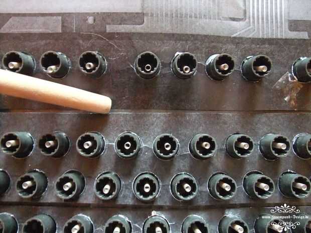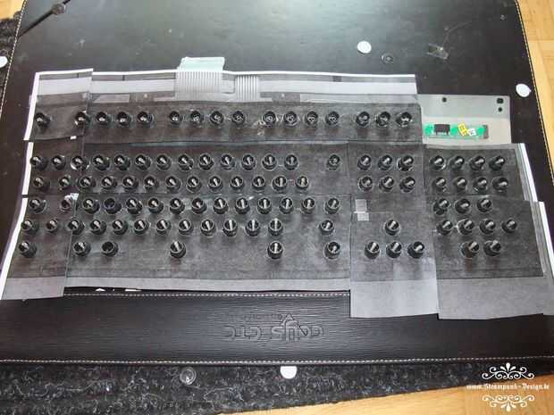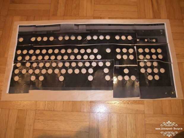 Ahora eres capaz de poner la plantilla en el teclado. Y ahora ves el gab que falta entre los botones que se basan en la forma curvada. Para obtener otra vez una plantilla completa fija las columnas de papel con adhesivo. Esto le da a la plantilla de las columnas de equilibrio necesario.