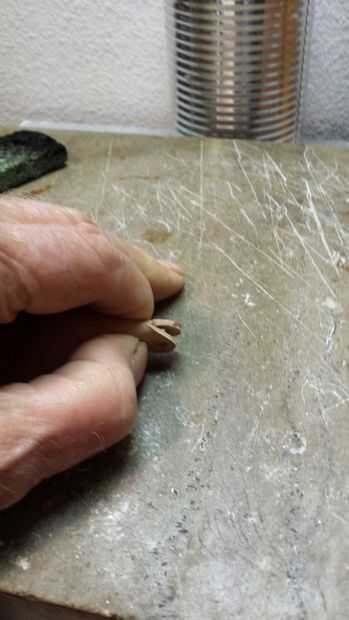También no se muestra es la escopeta 2 montara. Se cortaron moneda delgada usando un cortador de tubos y cartilla con un clavo y un martillo, limpiado y pulido con brasso pulidor de metal. se montaron con 2 remaches pequeños.