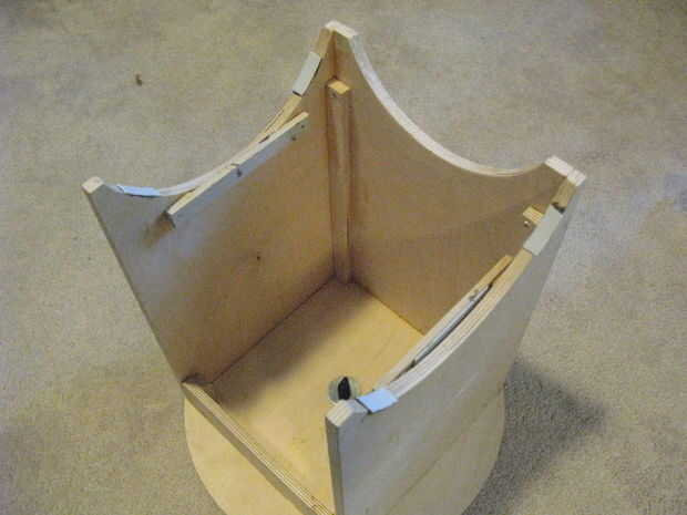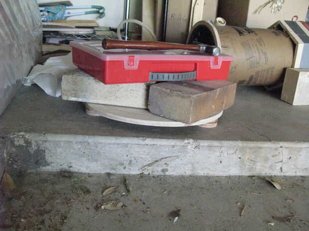 La base del eje de balancín es muy simple: sólo una pieza redonda de madera, con tres patas redondas (2.5" enchufes de usando un serrucho para cortar los orificios de aligeramiento en los ejes de balancín) y PTFE pastillas cerca de las piernas (para estabilidad), y un disco de vinilo insertado para que el PTFE en. Ladrillo utilizado para sujetar las almohadillas y las patas como en la primera foto.