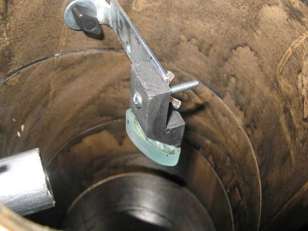 Con mi amigo mide apagado la mitad del diámetro del tubo y cortar un trozo de madera para ayudar a la franja del centro. Por otra parte, cortamos un pequeño trozo de madera para actuar como una pequeña escuadra de carpintero, para cuadrar la tira contra el tubo de enfoque (que acumulado en todo el camino). También, para obtener la vertical posicionamiento derecha, puso un colimador laser en el mecanismo de enfoque y utiliza Inkscape para dibujar centrado un poco objetivo que mi amigo corte y grabado sobre el frente de la secundaria. (Mi colimador láser emite una cruz, así que alineado con una de las cruces en el destino).