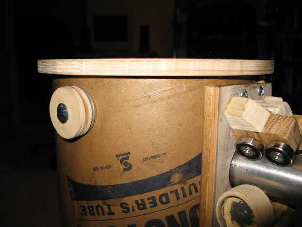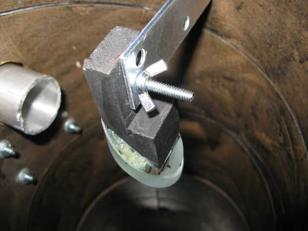 El soporte secundario se monta en el tubo con un tornillo de carrocería. Un extremo del perno de carro es cubierto con una tuerca de mariposa de plástico, y el otro va en un disco de madera contrachapada en la parte exterior del tubo.