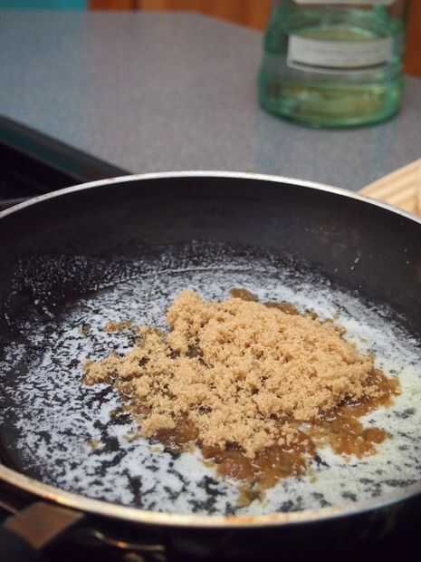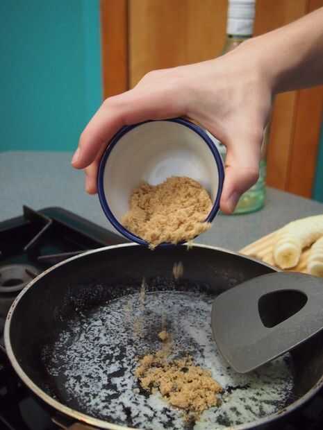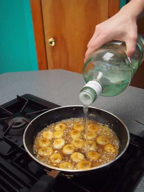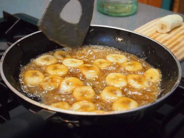 Cortar dos plátanos 1/2 pulgada rodajas. Derretir la mantequilla en una sartén a fuego bajo. Añadir el azúcar a la mantequilla derretida y revuelva hasta que se disuelva el azúcar moreno, dejar una salsa espesa. Añadir las rodajas de plátano y la salsa y cocer durante un par de minutos hasta que los plátanos estén suaves. Añadir el chorrito de ron y luego reducir la salsa por otro minuto.