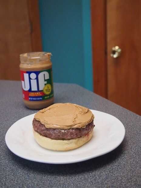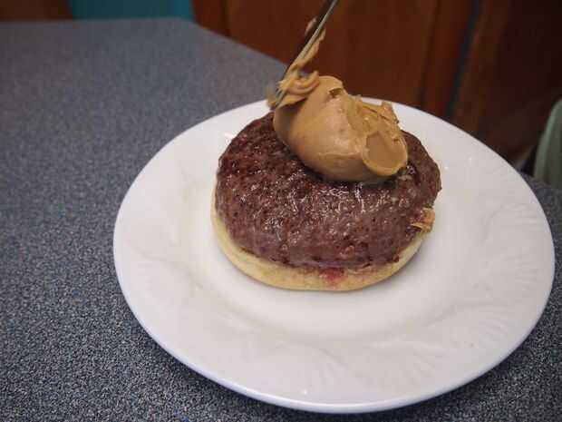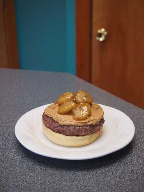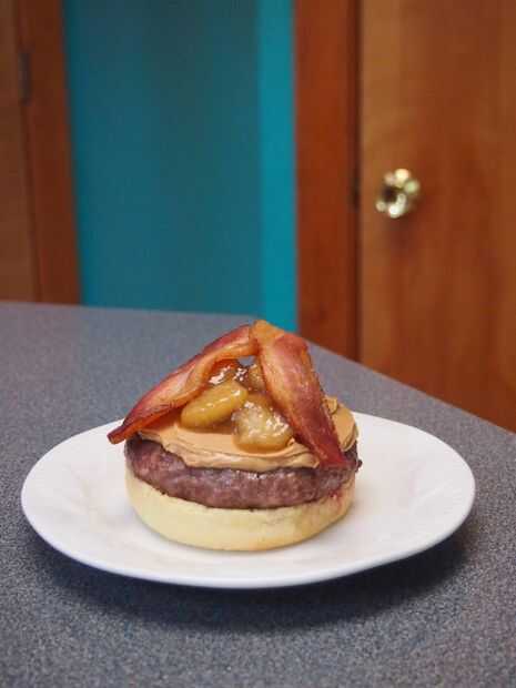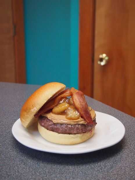 Primera fractura abierta del bollo de pan y coloque la empanada de la hamburguesa sobre el pan abierto. A continuación coloque una cucharada grande de mantequilla de maní sobre la empanada. He utilizado alrededor de 2 cucharadas. A continuación colocar algunas rodajas de banana sobre la mantequilla de maní. Asegúrese de que obtener algunas de la salsa que los plátanos se cocinan en como esto realmente se suma al sabor. Lugar las tiras de tocino encima de las rodajas de banana y finalmente tapa con el pan. Esta hamburguesa no debe requerir ningún condimentos adicionales.
