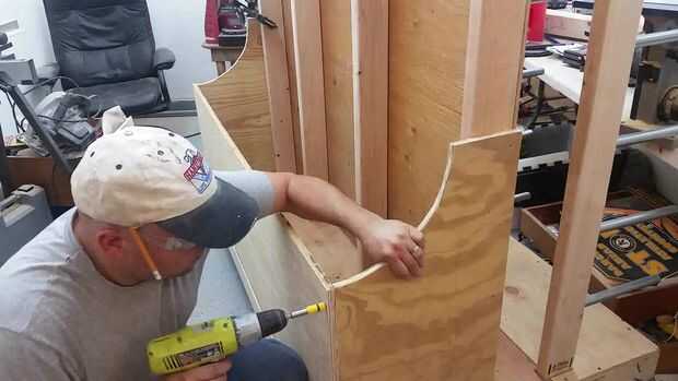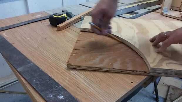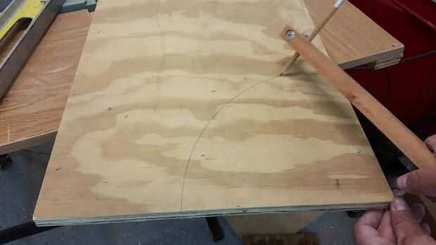 Corté una pieza de madera contrachapada de 3/4 para la base del gabinete. Mediante el uso de una brújula, he creado un radio en una esquina.