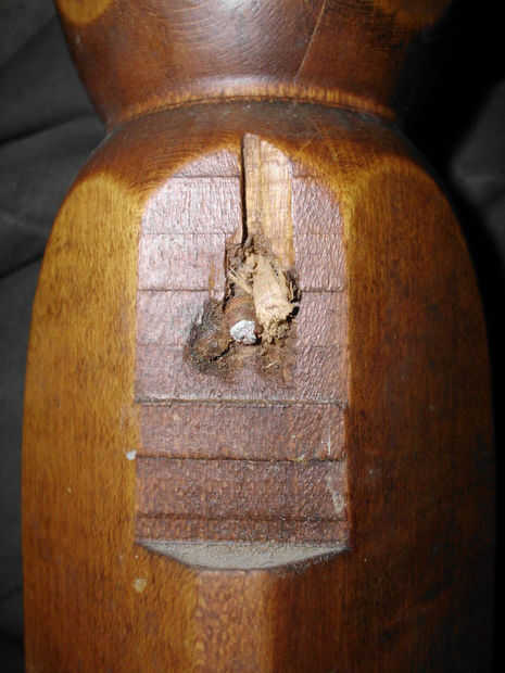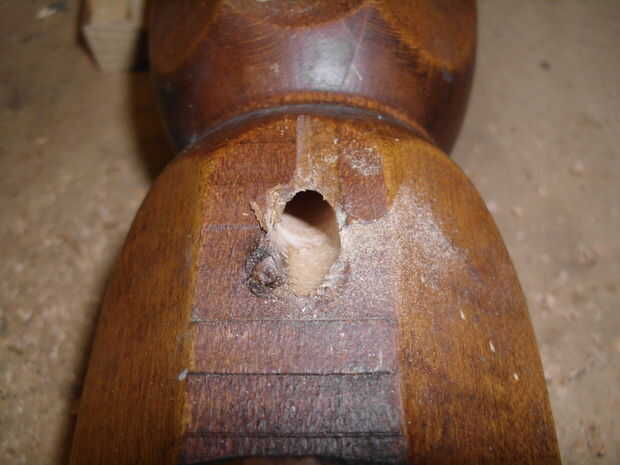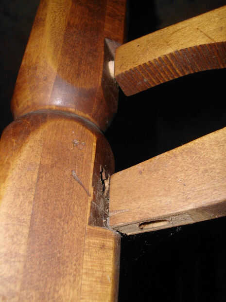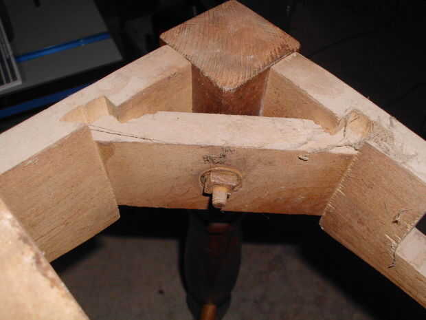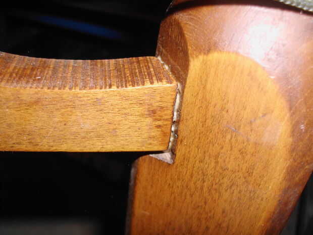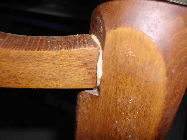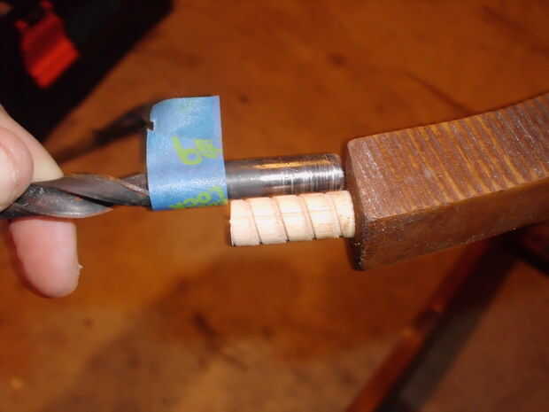El siguiente punto era los soportes transversales. Cada apoyo cruzado fue conectado a la pierna en dos lugares. En la conexión superior, había un taco y en la conexión inferior había un tornillo. Examiné cada cruz soporte accesorio para ver lo que falta por hacer. Todos los tacos estaban intactos, pero el pegamento que se utilizó para mantener en la pierna no había en cada uno de los tacos. También, uno de los tacos era demasiado largo para caber en su agujero. Revisé la profundidad del agujero que estaba con un trozo de cinta y taladro del pedacito y luego presentó la espiga hacia abajo hasta la longitud correcta. Luego lo pegué en el agujero usando el pegamento del gorila. Usé este pegamento en lugar de pegamento para madera para un par de razones. La primera razón es que estaba seguro si había todavía viejo pegamento en el agujero. Pegamento de madera sólo puede contener madera a madera. Debe ser capaz de conseguir en las fibras de la madera o no sostenga. Para asegurar que no había ninguna cola hubiera tenido que raspar o perforar el orificio y que haría que la espiga muy suelto en el agujero. Pegamento del gorila no tiene que ser de madera a la madera para obtener una buena adherencia. Puede enlazar con más nada. La segunda razón es que los agujeros ya estaban algo holgados en las espigas y pegamento gorila se expandirá como conjuntos que se rellene el espacio y hacer un buen ajuste.