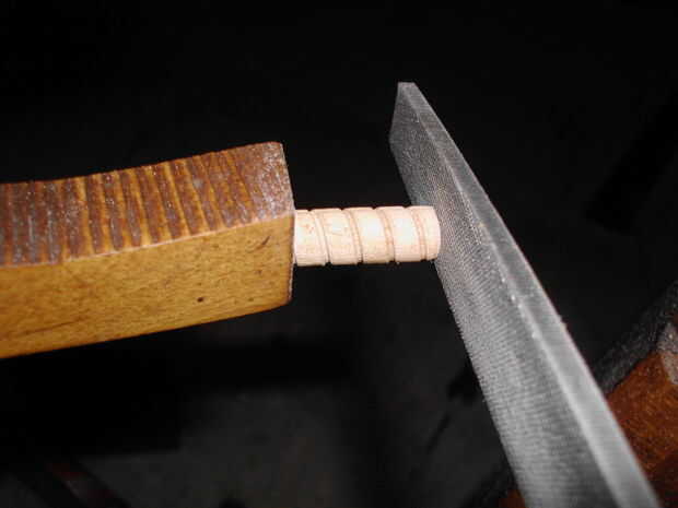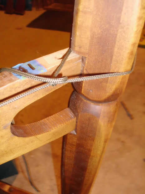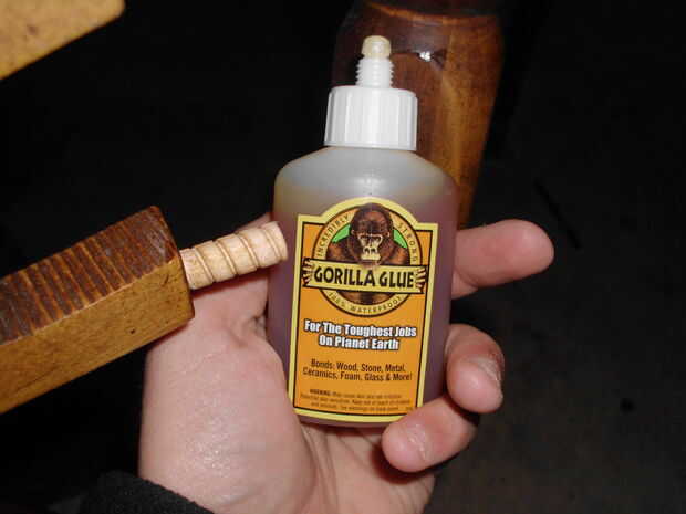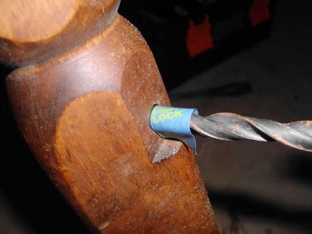 El agujero de en que mi rotura del tornillo fue fue masticó bastante arriba una vez que el tornillo, por lo que necesitaba para repararlo. Lo hice taladrar un agujero nuevo, más grande con una broca 5/16 bit y tapar ese agujero por pegar una pieza de 5/16 espiga. Una vez este seco, pongo la pierna en el lugar. Luego perforar un nuevo agujero para el tornillo de mi y pegado en la espiga. Había ceñido las piernas junto con unos pedazos de paracord mientras todo seco. Usé un nudo de combinación de un nudo tarbuck y una honda (cuerda) para tirar todo lo agradable y apretado hasta que el pegamento seca.