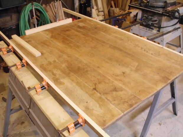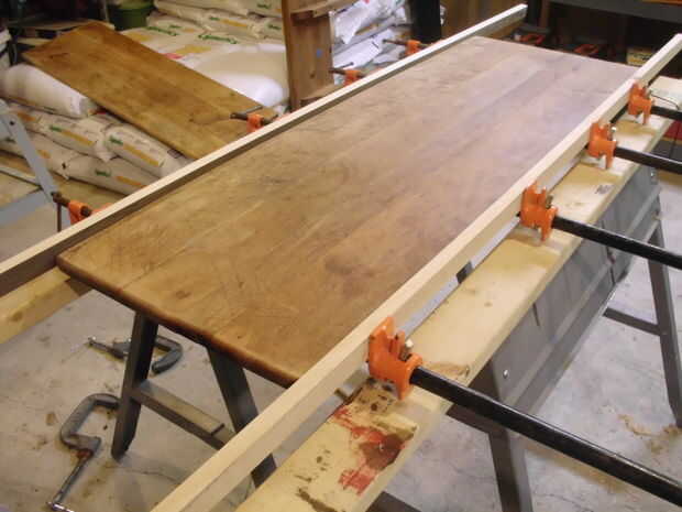 Ahora que el viejo final fue apagado, ya era hora para el pegamento. Hice el encolado en dos etapas para darme mejor control de la alineación de las juntas. Si solamente tenía a mí mismo con un tablero conocí a otro en vez de los tres a la vez, podría conseguir una costura mucho más suave. El proceso de pegado es bastante simple; Sólo corrí una gota del pegamento en el borde de ambos los tableros para encolar, asegurándose de que era agradable e incluso y completamente cubierto. Entonces yo sólo sujeta los tableros juntos, ajuste de uno a otro cuando fui a través de las abrazaderas de apriete y limpiando para arriba cualquier pegamento que exprimido hacia fuera con un trapo húmedo. He utilizado pedazos de desecho de madera entre las mordazas y el tablero de la mesa para que las pinzas no mar la madera. Usé pino para esto para que no deje ningún abolladuras en la mesa, ya que es una madera más suave que el arce que la tabla está conformada.