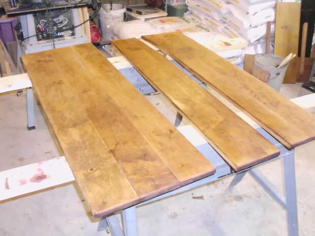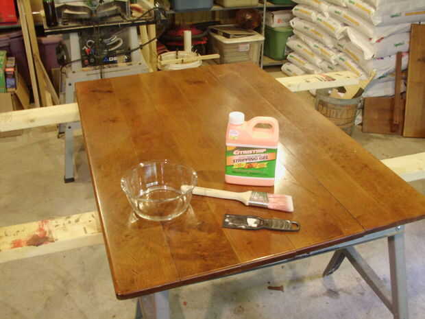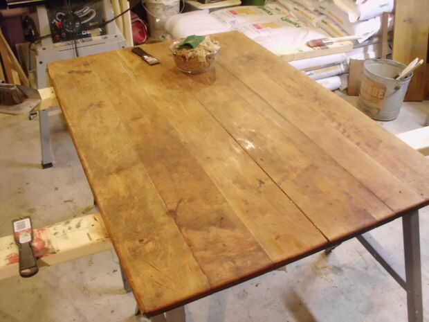 La mesa es una solución directa. La parte superior tenía dos divisiones que funcionaron de principio a fin, separando en tres pedazos. La primera cosa a hacer era quitar el acabado antiguo. Entonces tuve que pegar hacia arriba, vuelva a colocar la mesa y puso algunos poliuretano.