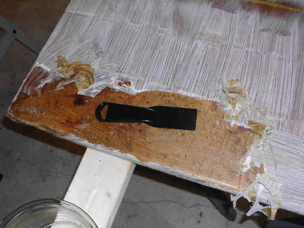 Nunca he usado un separador acabado antes, por lo que no estaba seguro cuánto utilizar. Las instrucciones dicen que use un cepillo para ponérselo y luego simplemente raspe lo después de por lo menos media hora, pero he encontrado en delgados como una capa de pintura no es el camino a seguir. Al menos para esta tabla, más fue definitivamente mejor. Una vez me había puesto bastante, todo burbujeado para arriba muy bien y sobre todo fue fácil para a raspar con el raspador de plástico. Algunas áreas debían hacerse dos veces y aún necesitaba un poco de presión extra con el raspador para llegar, pero todo salió bonito y limpio.