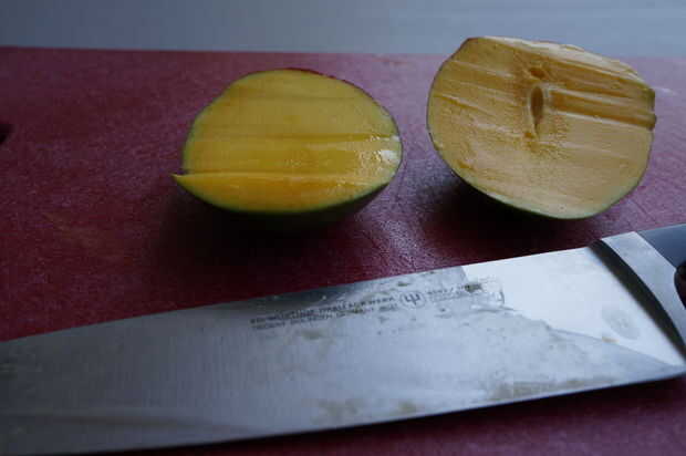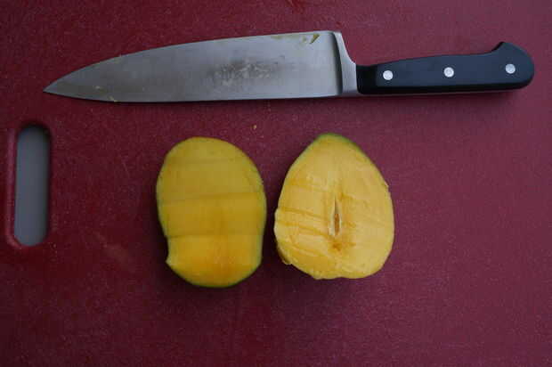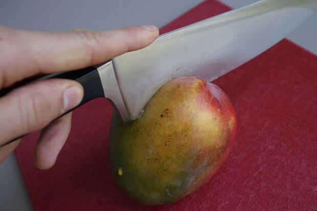 Cada mango tiene un hoyo en el centro. Así que primero lo primero, usted necesitará cortar tanta fruta como puedas de cada lado de su deliciosa fruta.