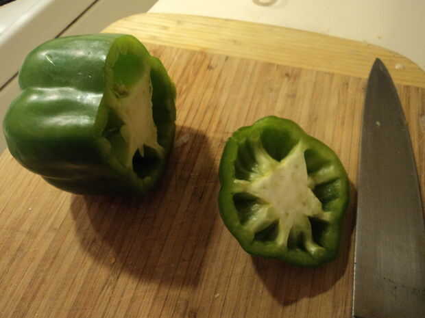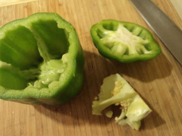 2. Cortar la parte superior de tus pimientos verdes y del casco de las semillas y membranas conexión