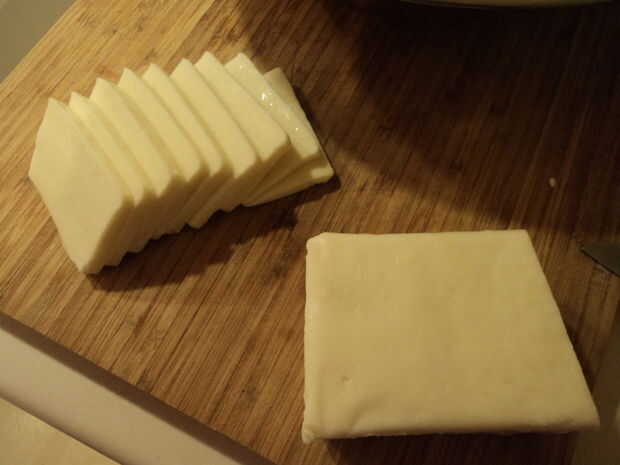 1. Rebanar el queso paneer en rodajas de aproximadamente 1/3 de pulgada de grosor