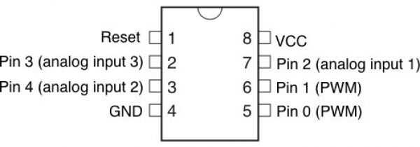 Pequeño Arduino tienen sólo ocho pines como se muestra en la figura anterior, Pin4 es tierra (Gnd), Pin8 es 5V (Vcc), se restablece el Pin1, Pin2 y Pin3 originalmente utilizan para conectar el cristal. Para utilizar la IO, el oscilador interno (oscilador RC) se utiliza para reemplazar el reloj externo que requiere un cristal. Por lo tanto el pequeño Arduino ahora es venir con cinco IO. A continuación muestra las funciones de IO de Arduino.