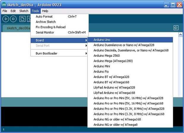 4. Seleccione Herramientas > Junta Directiva > Arduino Duemilanove o Nano w/ATmega328 o Arduino UNO de menú