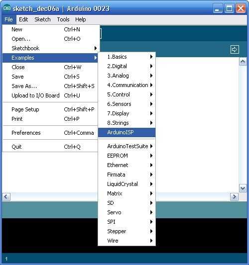 3. Seleccione Archivo > ejemplos > ArduinoISP del menú como se muestra en la figura
