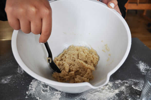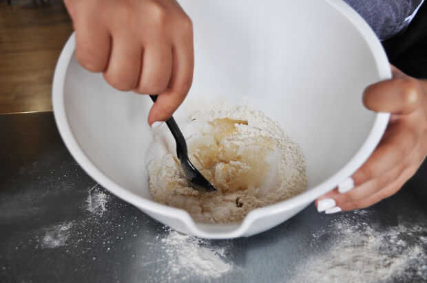 Añadir las tres cucharadas de aceite de girasol. Mezcle una pequeña cantidad de agua destilada (aproximadamente una cucharada) y revolver bien. Cuando toda el agua se absorbe en la mezcla, repetir este último paso - agregar una cucharada extra de agua destilada. Amasar más agua en la masa, para crear una estructura de masa pegajosa. Ahora añadir la harina restante hasta alcanzar la textura adecuada, cuando la masa ya no esté pegajosa. Tan pronto como llegue a esta etapa, amasar la mezcla en la forma de una bola.