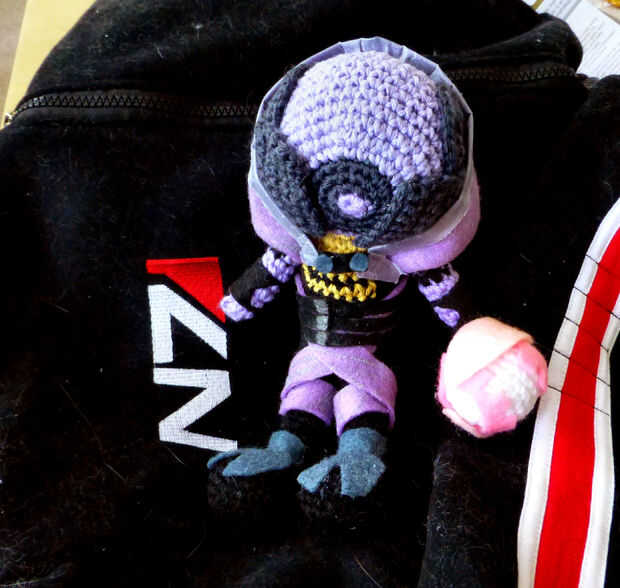 aquí es mi segundo compañero de Escuadrón de ganchillo Mass Effect Tali Zorah vas Normandy. Junto a Liara, ella es mi segundo compañero de Escuadrón favorito sacar en misiones. También hizo su defensa drone Chatika Eva Paus. Usted puede a menudo oír sus gritos "ir para la óptica, Chatika! Go para la óptica!"durante el juego, que si eres un fan de Bioware, sabrías que es una referencia a algo que minsc dice en gate de Baldur's II.