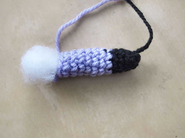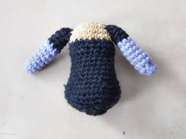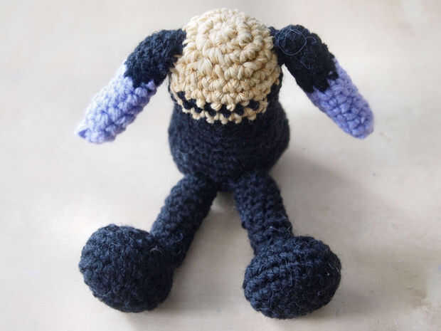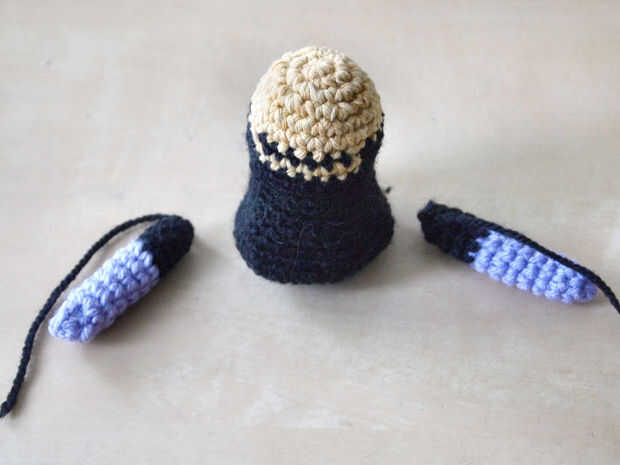 Coser los brazos a los lados del torso (extremo negro en la parte superior), debe fijarse en la parte superior de la zona amarilla. Coser las piernas al frente para que el cuerpo está en una posición sentada.