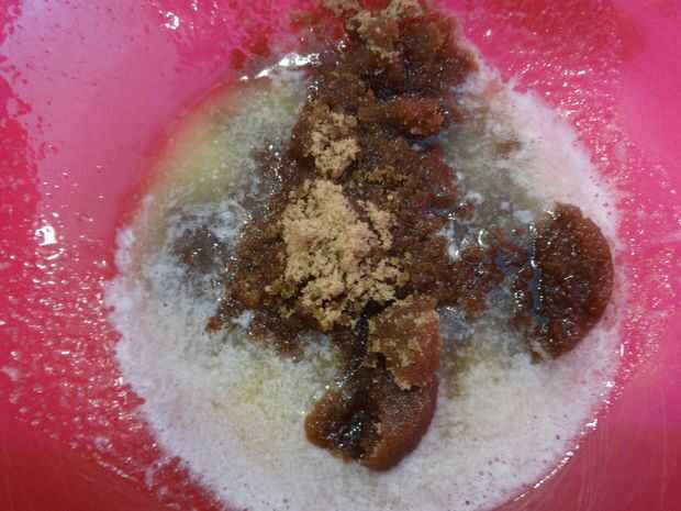 Mezclar la mantequilla blanda y el azúcar morena. Luego se mezclan en el resto de los ingredientes.
