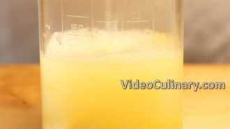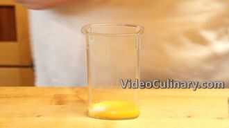 Hacer la masa de hojaldre rápida: colocar una yema de huevo en una taza de medir. Añadir 1/4 cucharadita de sal y 2 cucharaditas de vinagre. Añadir aproximadamente 100 ml de agua helada y mezclar bien. En total, debemos tener 125 ml de líquido. Poner en la nevera.