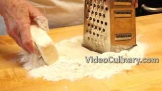 Tamizar 250 gramos de harina en la mesa. Rejilla 200 gramos de margarina o mantequilla congelada en la harina, mezclar la mantequilla con la harina con frecuencia.
