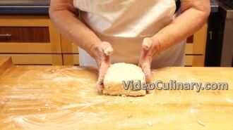Hacer un pozo y vierta el líquido y la mezcla. No amasar la masa. Doblar sobre sí mismo: Levante los lados y doble hacia el centro, creación de capas. Se reúnen los trozos de masa a la izquierda en la tabla y añadir a la masa.