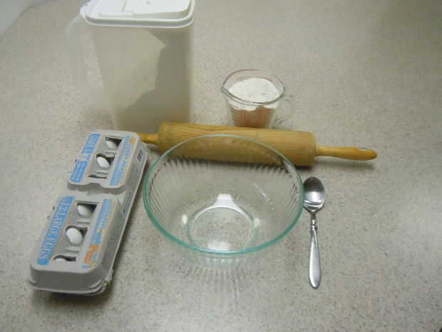 Todo lo que necesitas es harina (usé para todo uso, pero añadiendo harina alta en proteínas ayuda a), los huevos y agua.