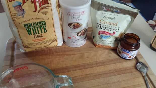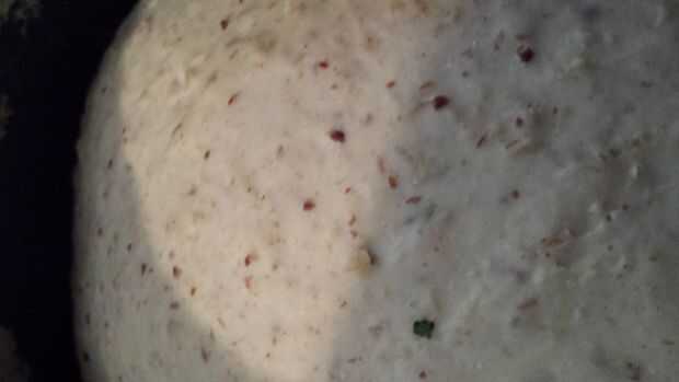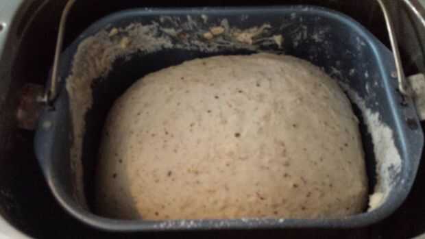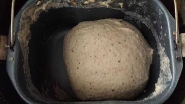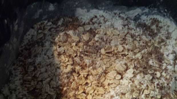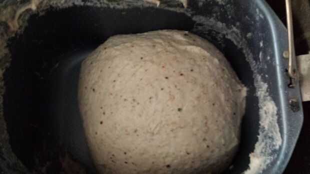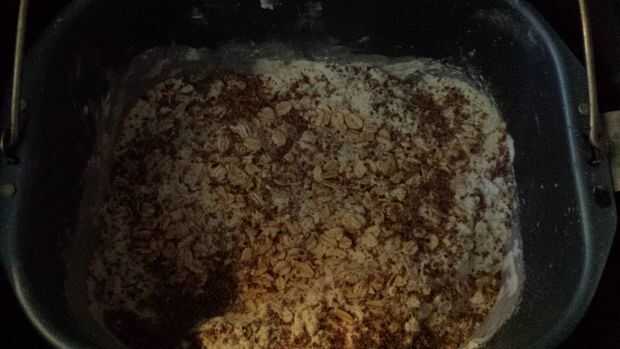 Añadir agua, harina, harina de lino, avena, levadura, sal marina, aceite de oliva al pan en configuración de "Masa". Empezar a mezclar y agregar ingredientes para conseguir una bola abundante de la formación de masa.