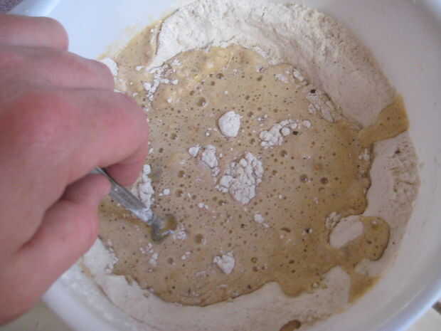 2 Agregue los ingredientes húmedos y mezclar hasta que la mezcla es espesa e incluso