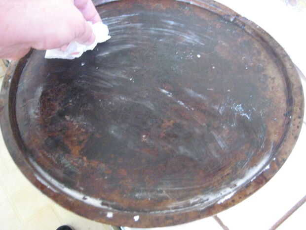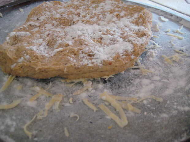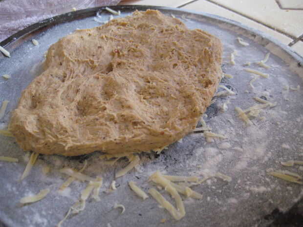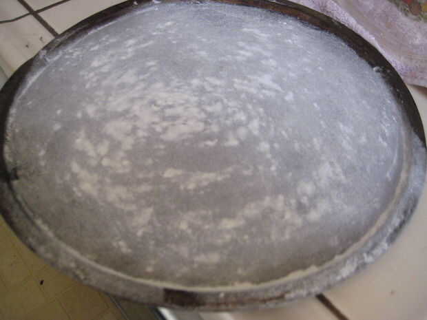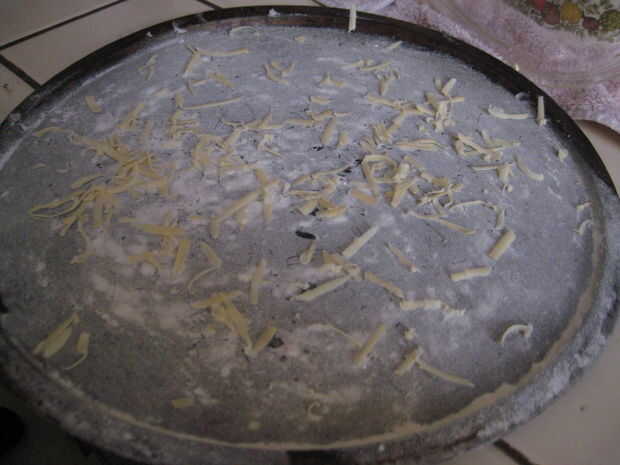 4 grasa y ligeramente la flor su bandeja para pizza. Usted puede también ligeramente espolvorear un poco de queso, así si