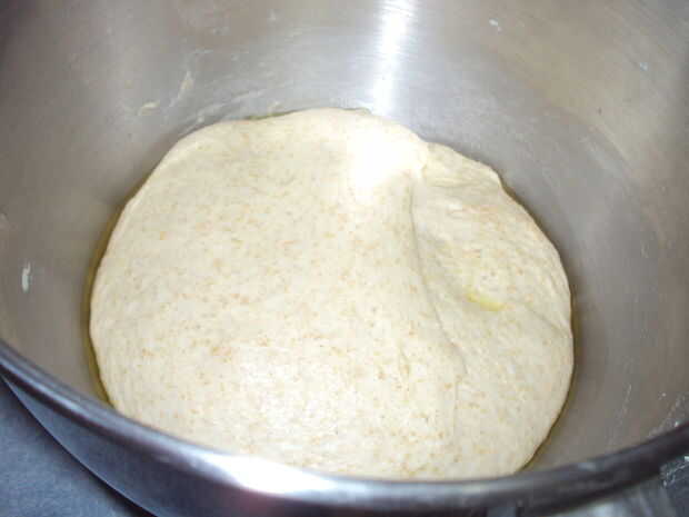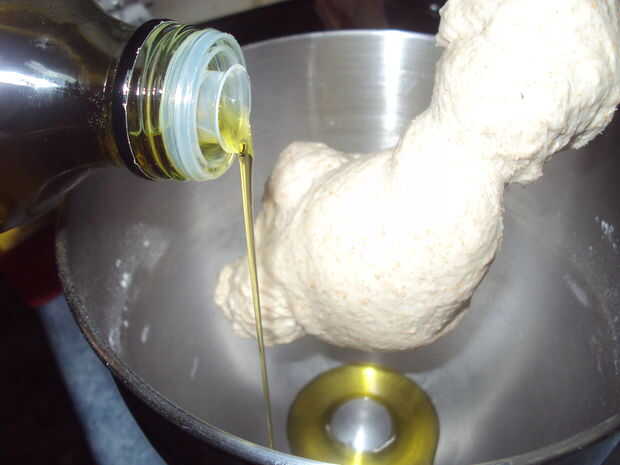 Cubrir la bola de masa con unas gotas de aceite adicional. Lo que hice esta vez fue inclinar la batidora eléctrica hasta vierta aproximadamente una cucharada de aceite en el recipiente y la presión la masa del gancho y luego rodar la pelota de masa en el aceite.