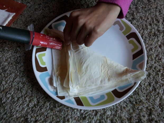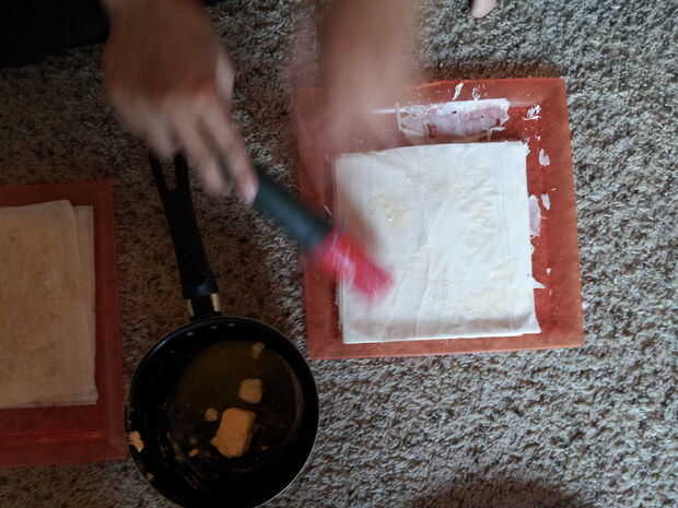 5) después de llenar el fillo capas con relleno de atún, puede pegar la capa junto con la mantequilla de ablandar. Puede cepillar todos los rincones con mantequilla y luego les pegan.