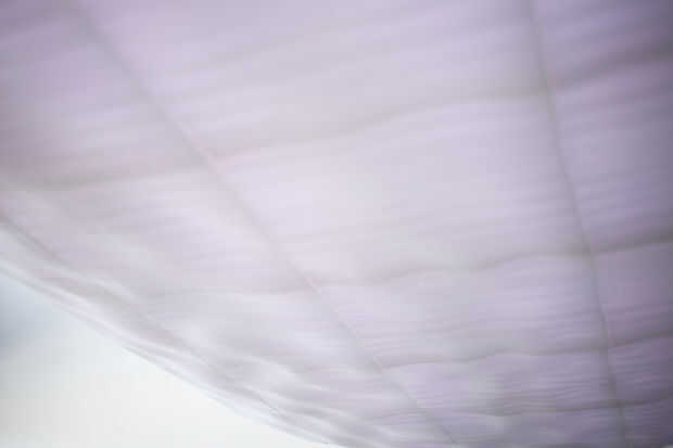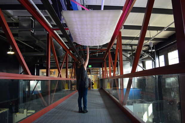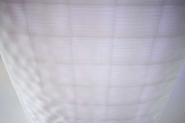 Ligero y hecho a mano de bioplástico impreso 3D, el trabajo se integra con una estructura de aluminio, que proporciona refuerzo estructural y un punto de conexión para el dispositivo de suspensión. Escala en 4 1/2 x 8 pies, nuestro injertado "techo drop" interactúa con la luz, aire y la estructura del anexo, específicamente en lo referente a las vigas del marco original.
