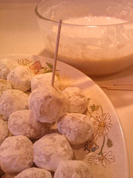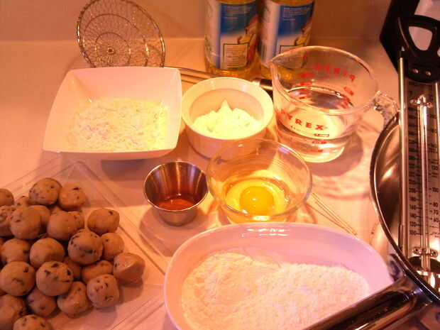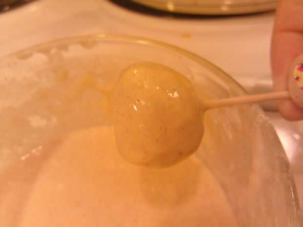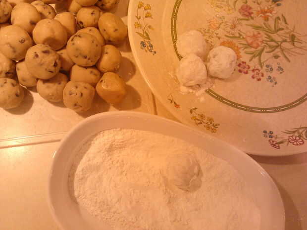 Dragar primero las bolas de helado de galleta en la fécula de maíz y desprender el exceso de polvo. Usando un palillo de dientes para recoger la bola de cornstarched, puede agitar la bola de masa de galletas en la mezcla y golpee la parte trasera extra en el recipiente. Ahora puede transferir el balón maltrecho en el aceite caliente sin las manos sucias!