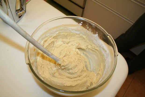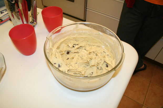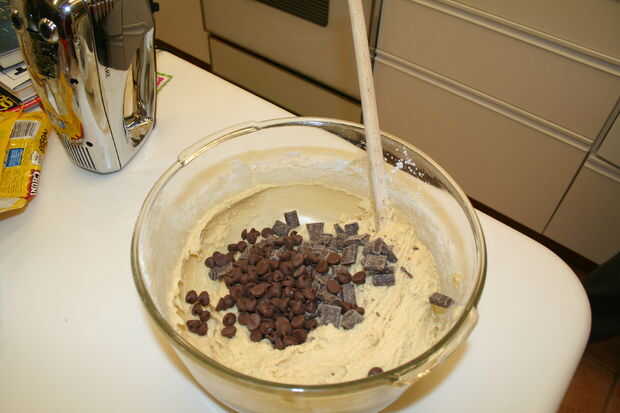 Tomar el tazón de fuente de ingredientes húmedos y poner un poco de la mezcla de harina en. Utilice una espátula de madera, ya que la batidora eléctrica hará que la masa demasiado fina. Tomar sus chocolate chips/trozos y mezclarlas en.