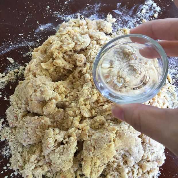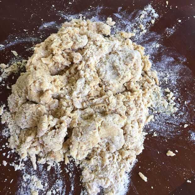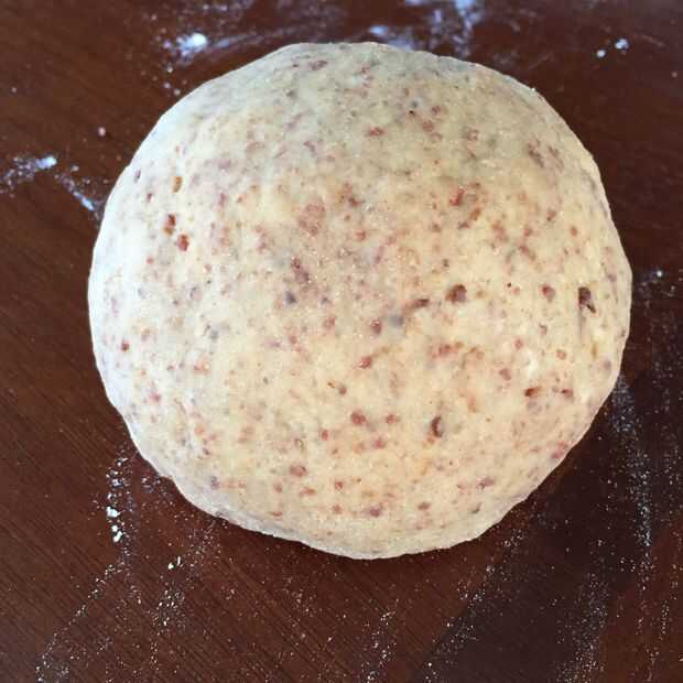 Vierta la harina / mezcla de bacon sobre una superficie plana en una pila. Crear un pozo en el centro para sostener los huevos (esto puede ser sucio si no crea un agujero cerrado). Coloque los huevos en el centro del pozo. Con un tenedor suavemente mezclar y la harina poco a poco incorporar el huevo. Las manos y combinar la harina, añadir agua si es necesario. Luego amasar de 5 a 8 minutos.