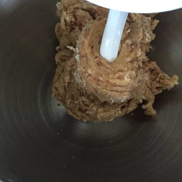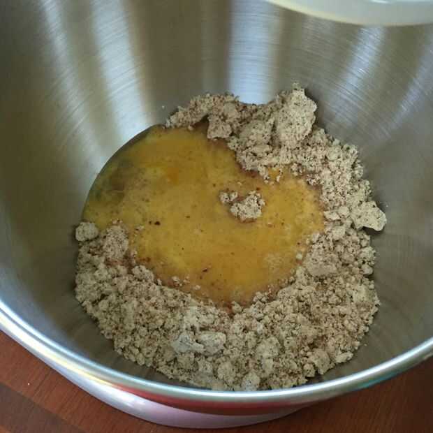 Si tienes una kitchenaid pones la mezcla de harina/tocino en el tazón de la batidora. Agregue los huevos batidos y