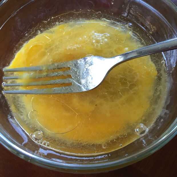 Tomar la grasa de tocino derretido y añadir a los huevos, batir brevemente para combinarlos.