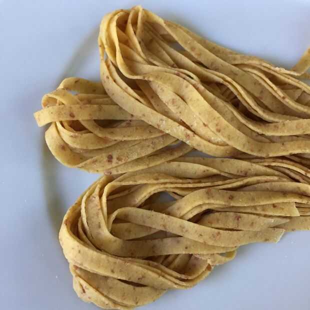 Tomar una pieza y pase a través de la máquina de pasta en la posición más amplia. Doble como Ensobrado y pase 3 veces repetir el doblez. Ahora se ejecutará la masa a través de haciendo el ajuste más pequeño cada vez. Al llegar el espesor deseado que la pasta se siente durante 10 minutos antes de cortado en tallarines. Para fettuccine usé la posición #3 en mi máquina de pasta imperia.