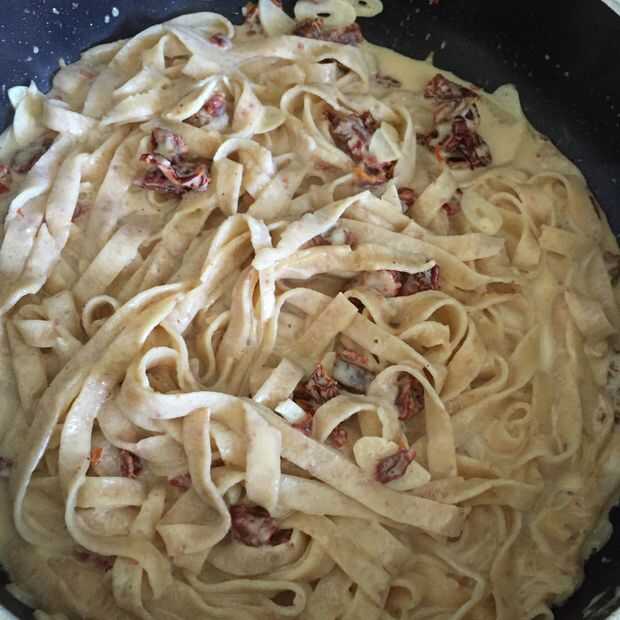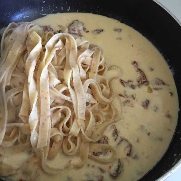 Después de cortar la pasta póngala a un lado y prepara el agua salada hirviendo. Hervir de 4 a 7 minutos. Se cocina muy rápido así que mantener un ojo sobre ellos. Añadir la pasta directamente a tu salsa y listo!
