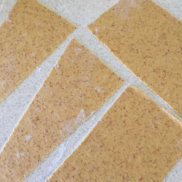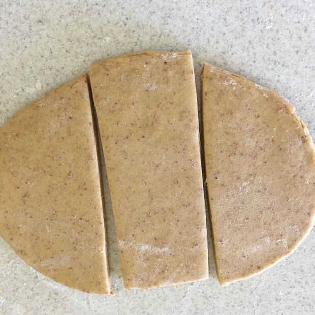Después de que la masa ha reposado se rodar a unos 3/8 de espesor y cortar en trozos más pequeños de 3-4.