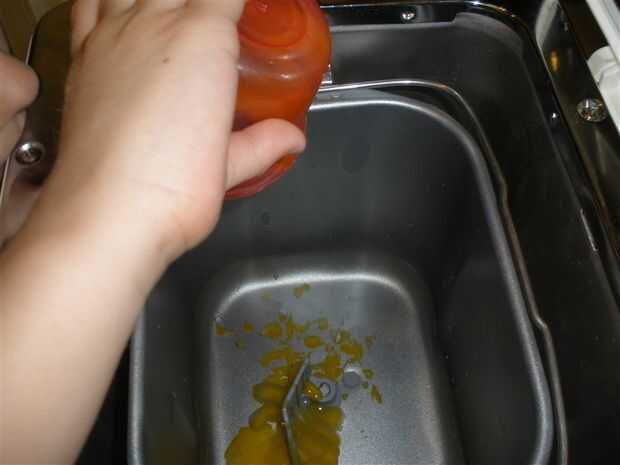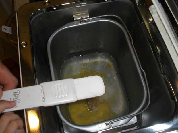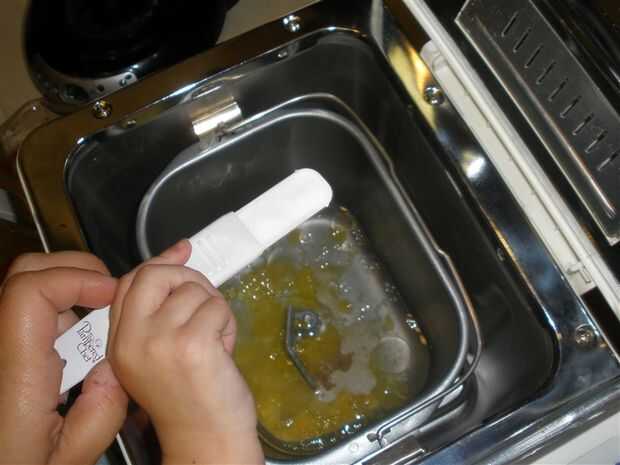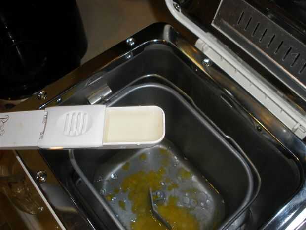(2) en el recipiente limpio con la panificadora, poner primero los ingredientes líquidos. Es el agua, la yema de huevo y el aceite.
