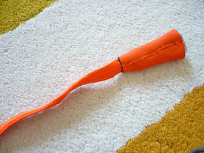 Después de que el silicio ha curado, lo saca de la negativa. Cubrimos la parte de cable plano con el material de exceso de jursey que salió de la hoja del neopreno, pero puede utilizar cualquier otro tipo de tela cubrimos el tapón de silicona con neopreno (ver último paso del masaje me chaqueta de bien coser el neopreno juntos. Utilizar el pegamento entre la silicona y de neopreno para evitar resbalones.