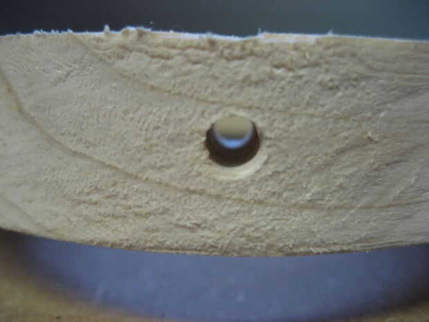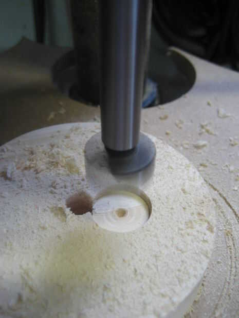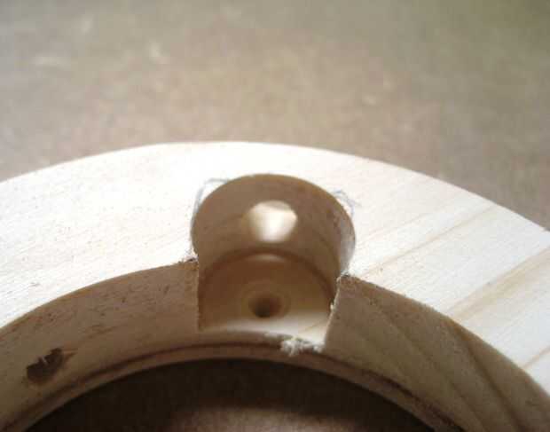 • En el círculo de la parte inferior perfore un orificio de 4 mm profundidad exacto al lado del centro, use la broca de 20 mm. El propósito de este agujero es evitar que el contrapeso del motor haga contacto con la madera (consulte el paso 7, 9).