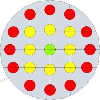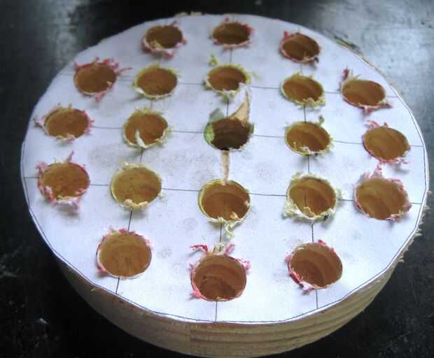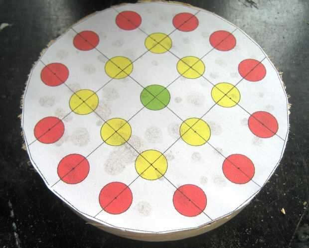 Hacer un lay-out de 20 marcas. A continuación perforar (utilice una broca de 10 mm) en las marcas: las marcas externas (rojo en la imagen) será 10 mm perforado profundo, las marcas internas (amarillo en la imagen) será perforado de 7 mm de profundidad.
